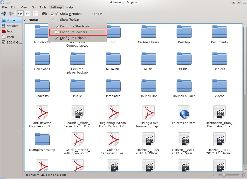 Adding menus works exactly the same way in both managers (the only difference is that Konqueror is also a web browser too). I'm using Dolphin today. So, fire it up and select Configure Dolphin from the drop-down Settings menu.