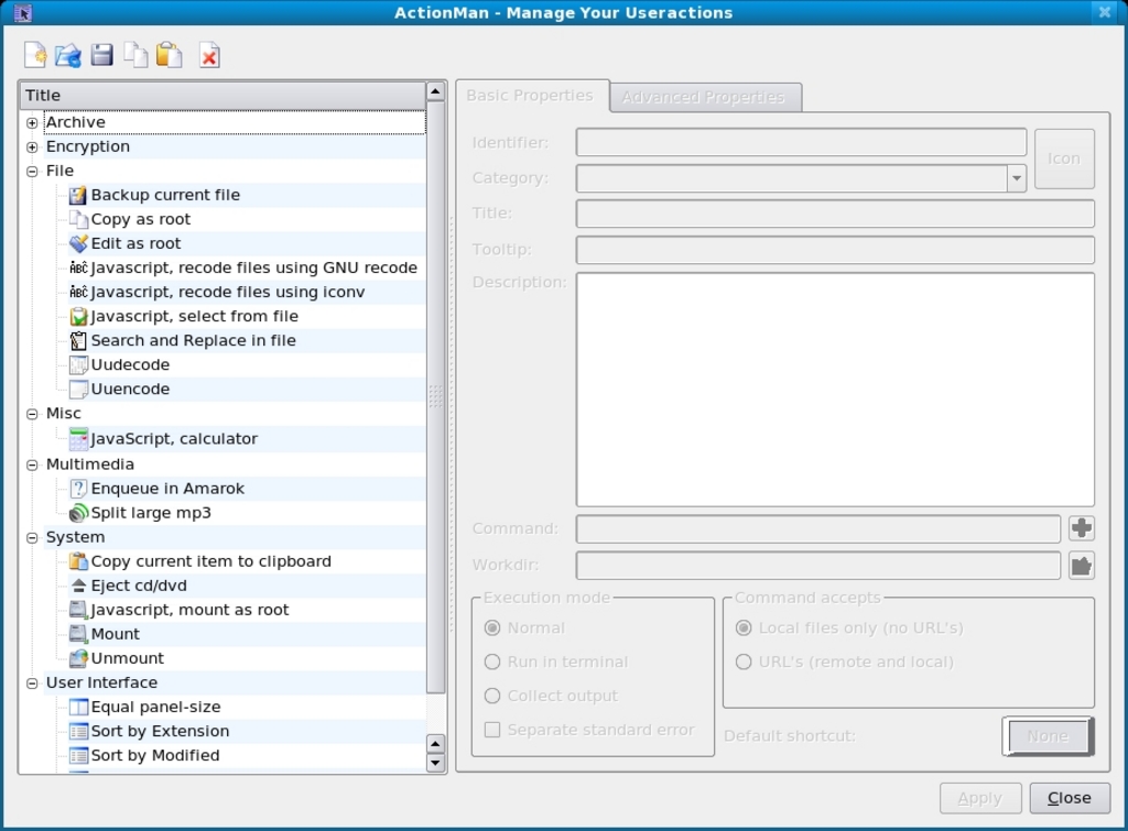 In some ways this is the crown jewels of Krusader. It is what really makes it so powerful and customisable. Perhaps it is Krusader's answer to Konqueror's underused extensions. Either way, it is what puts Krusader on steroids. Essentially, what you have here is user-specified scripts that do not require expert programming skills and can executed with a single mouse click or a keystroke.